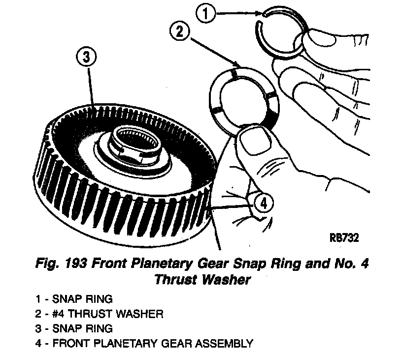 4. Install a NEW front planetary gear snap ring and #4 thrust washer (Fig. 193).
