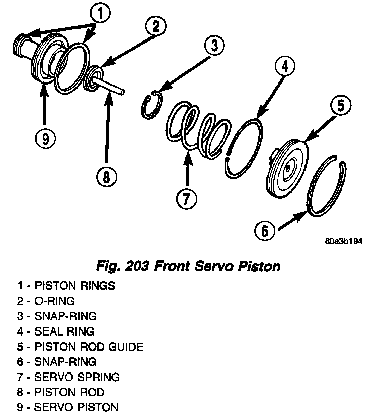 2. Install rod in piston. Install spring and washer on rod. Compress spring and install snap-ring (Fig. 203).
