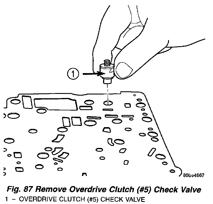 (9) Remove the overdrive clutch (# 5) check valve (Fig. 87)