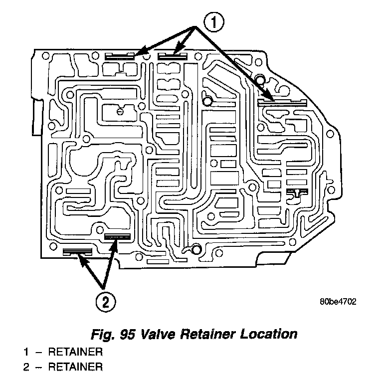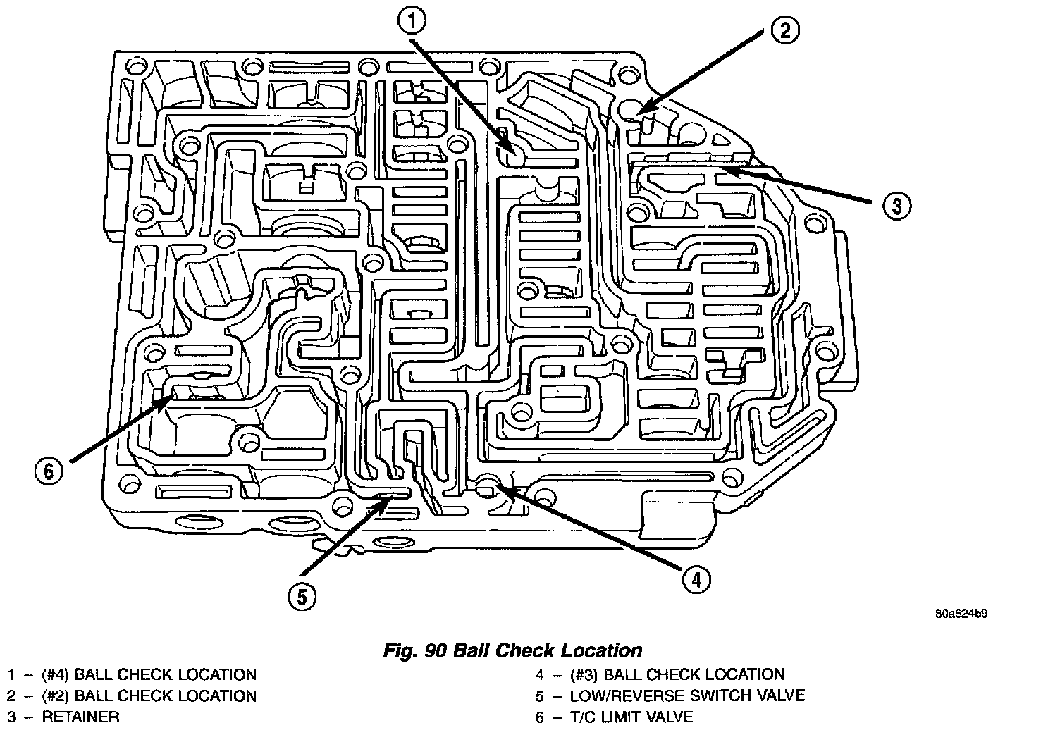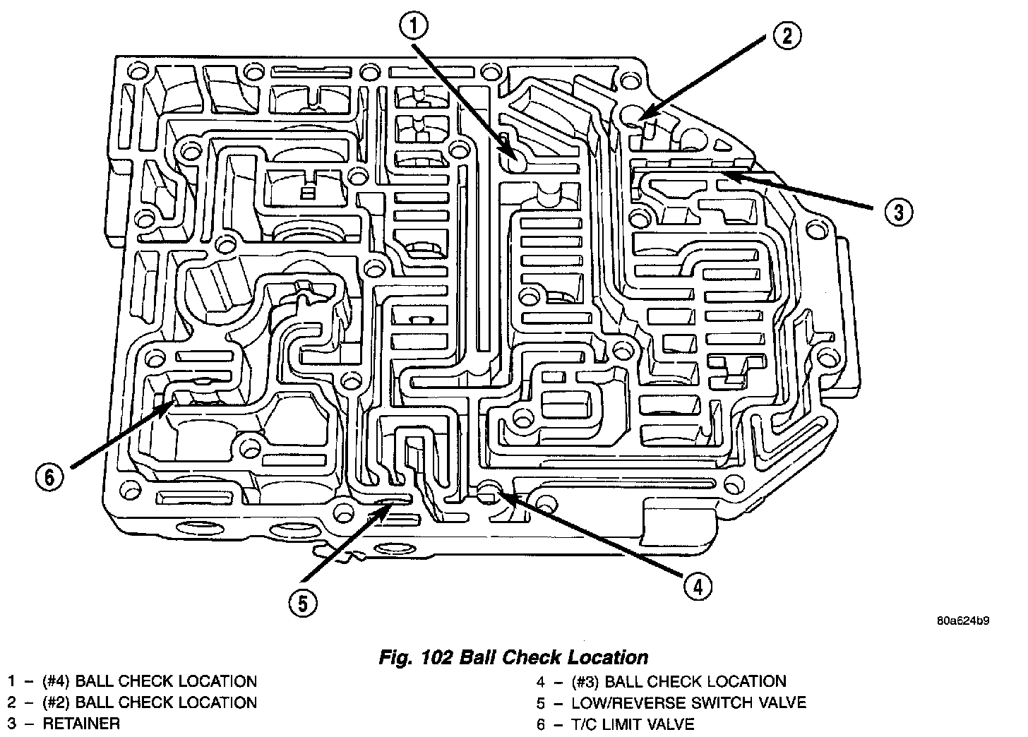 (7) Install check balls into position as shown in (Fig. 102). If necessary, secure them with petrolatum or transmission assembly gel for assembly ease.