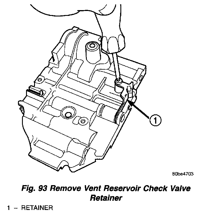 (15) Remove the vent reservoir check valve retainer (Fig. 93).