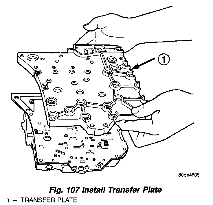 (12) Install transfer plate to valve body and separator plate. Make sure oil screen and # 5 check valve do not bind (Fig. 107).