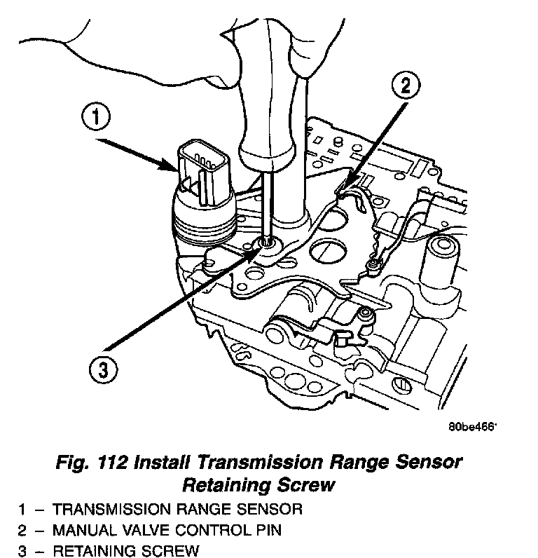 (17) Make sure Manual Valve control pin is contained within the rooster comb slot (Fig. 112). Install Transmission Range Sensor retaining screw (Fig. 112) and torque to 5 Nm (45 in. lbs.).