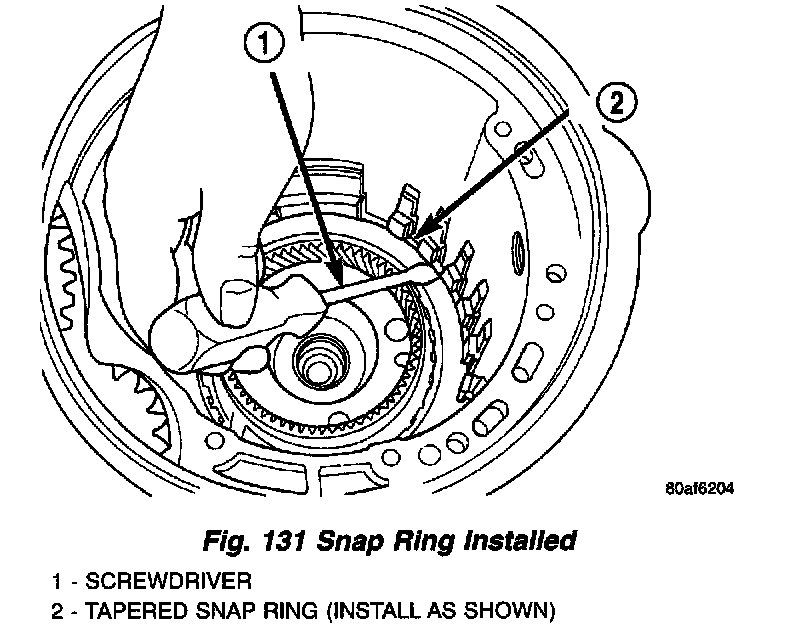 42. Install tapered snap ring (with tapered side out) as shown in (Fig. 130) (Fig. 131).