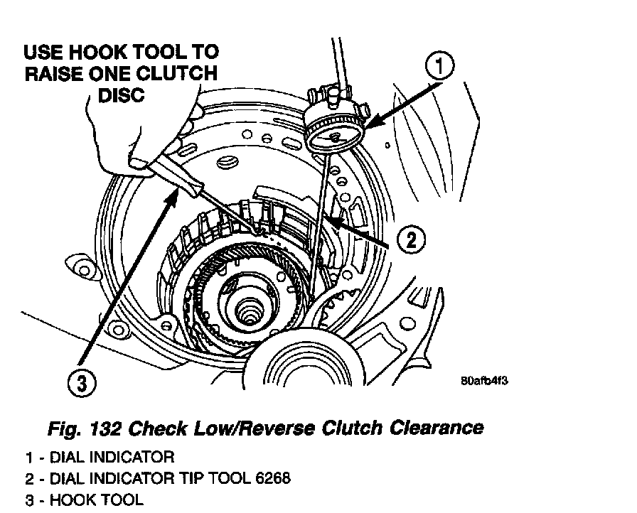 43. Set up dial indicator as shown in (Fig. 132) to measure low/reverse clutch clearance. Press down on clutch pack with finger and zero dial indicator. Low/Reverse clutch pack clearance is 0.89 - 1.47 mm (0.035 - 0.058 inch). Select the proper low/reverse reaction plate to achieve specifications: