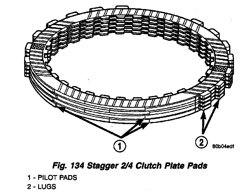 44. Install 2/4 clutch pack (Fig. 133), staggering clutch plate pads as shown in (Fig. 134).