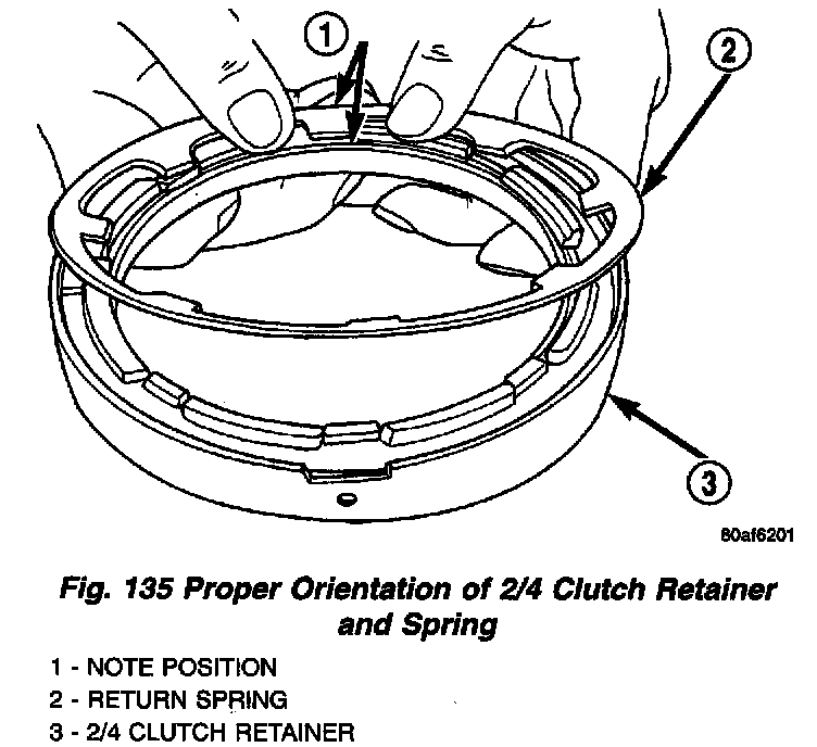 45. Orient 2/4 clutch return spring to retainer as shown in (Fig. 135), and install to transaxle (Fig. 136).