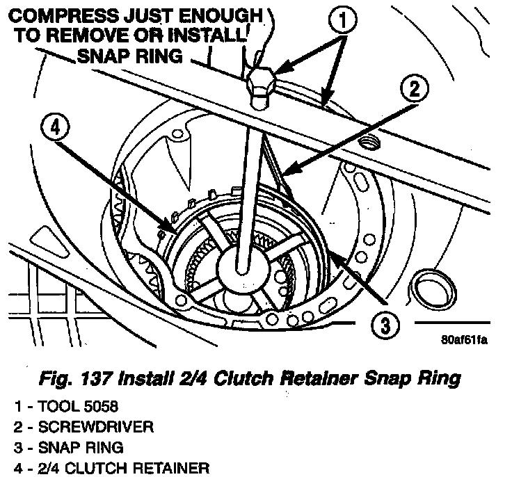 46. Using tool 5058, compress 2/4 clutch return spring just enough to install snap ring (Fig. 137).