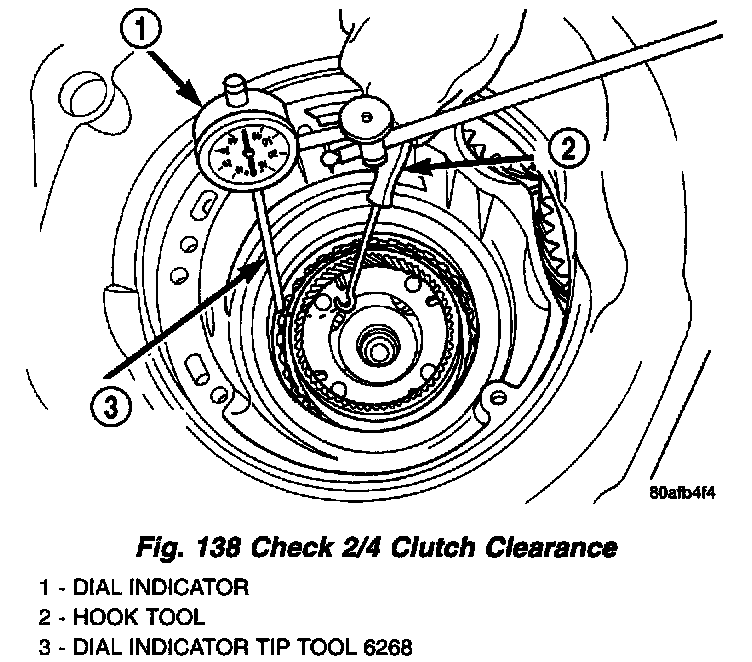 48. Set up dial indicator as shown in (Fig. 138) and measure 2/4 clutch clearance. Press down on clutch pack with finger and zero dial indicator. 2/4 clutch pack clearance is 0.76 - 2.64 mm (0.030 - 0.104 inch). If clearance is outside this range, the clutch is assembled improperly. There is no adjustment for 2/4 clutch clearance.