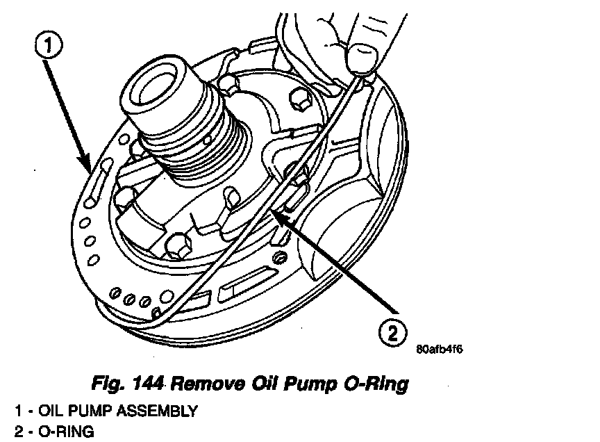 c. Remove oil pump O-ring (Fig. 144). Be sure to reinstall oil pump O-ring after selecting the proper # 4 thrust plate.