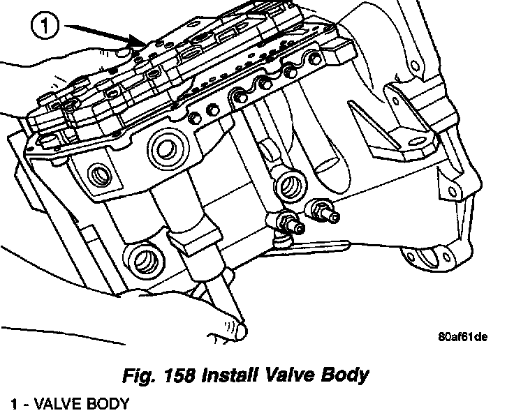63. Install valve body to transaxle (Fig. 158). Rotate manual valve shaft fully clockwise to ease installation. Make sure park rod rollers are positioned within park guide bracket.