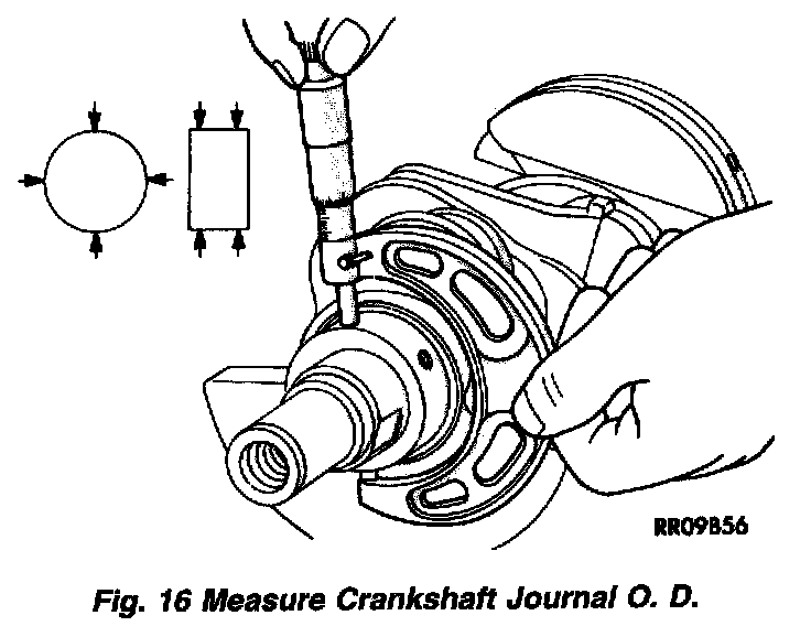 Measure the journal outside diameter for out-of-round and taper (Fig. 16). Refer to Engine; Specifications. If measurements exceed the specifications limit, machine or replace the crankshaft as necessary.