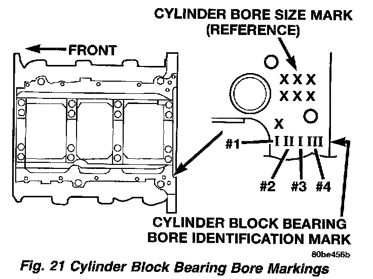 2. The identification mark for the diameter of the cylinder block bearing bore is embossed as shown in (Fig. 21), starting from the # 1 mark at the front of the coning
