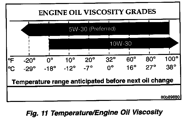 An SAE viscosity grade is used to specify the viscosity of engine oil. Use only, engine oils with multiple viscosities such as 5W-30 or 10W-30. These are specified with a dual SAE viscosity grade which indicates the cold-to-hot temperature viscosity range. SAE 5W-30 engine oil is preferred. Select an engine oil that is best suited to your particular temperature range and variation (Fig. 11).