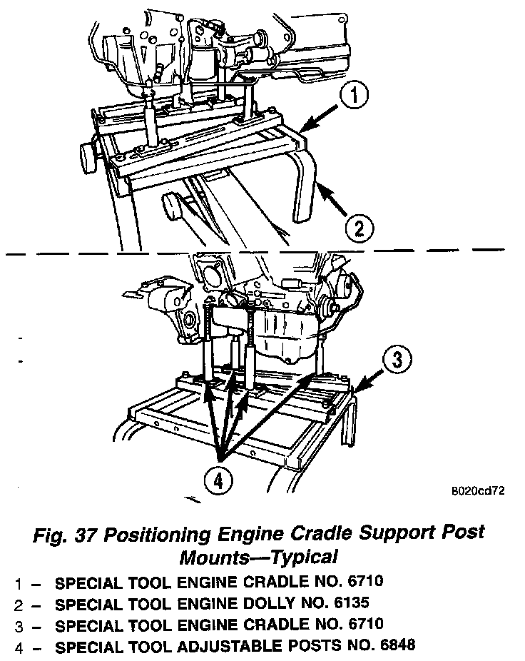 26. Raise vehicle enough to allow engine dolly Special Tool 6135 and cradle Special Tool 6710 with post Special Tool 6848 and adaptor Special Tool 6909 to be installed under vehicle (Fig. 37).