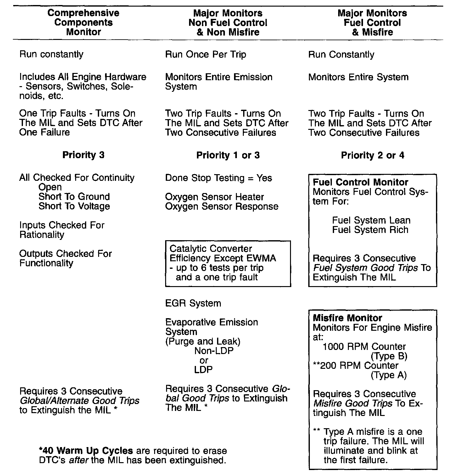 The above table summarizes the operation of the various OBD II monitors.