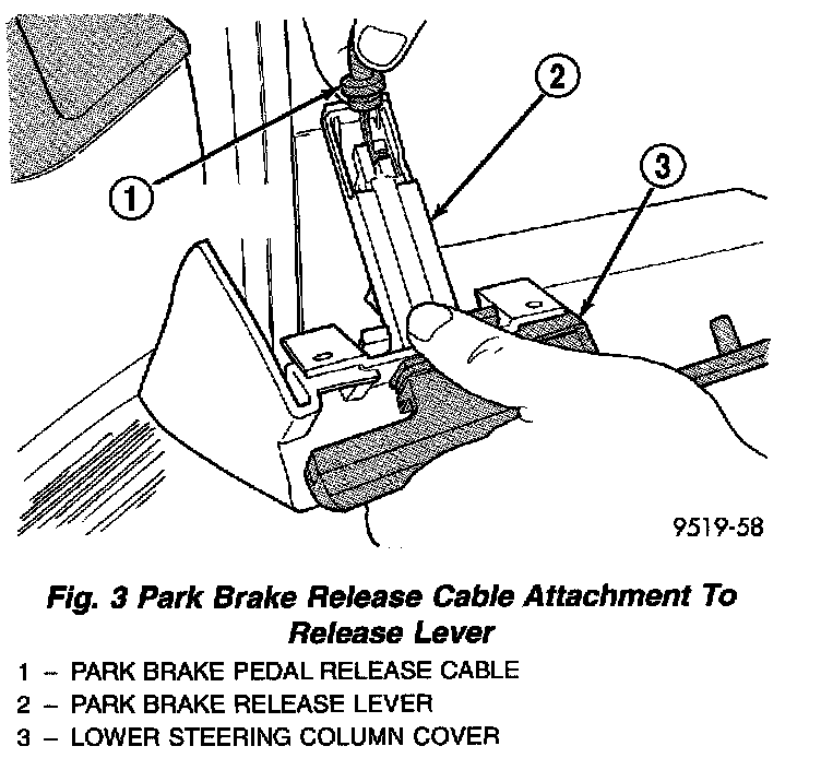 26. Install the parking brake pedal release cable on the parking brake release lever in the lower steering column cover.