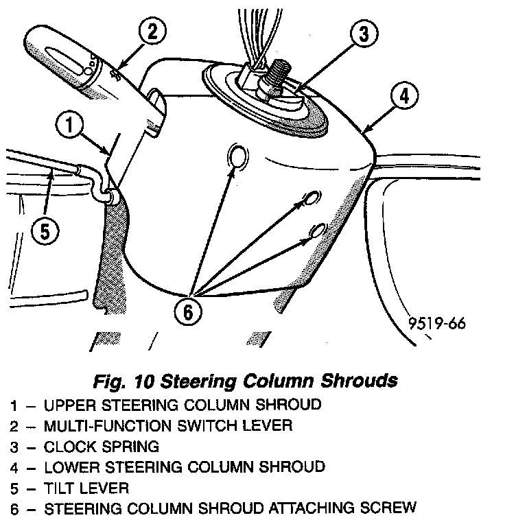 12. Remove the 3 screws attaching the upper and lower shrouds to the steering column. Then remove the upper and lower shrouds from the steering column.