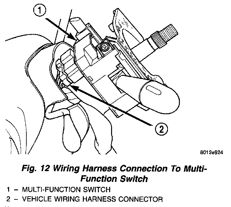 13. Install the vehicle wiring harness connector on the multi-function switch. Be sure latch on connector is fully engaged with tab on switch.