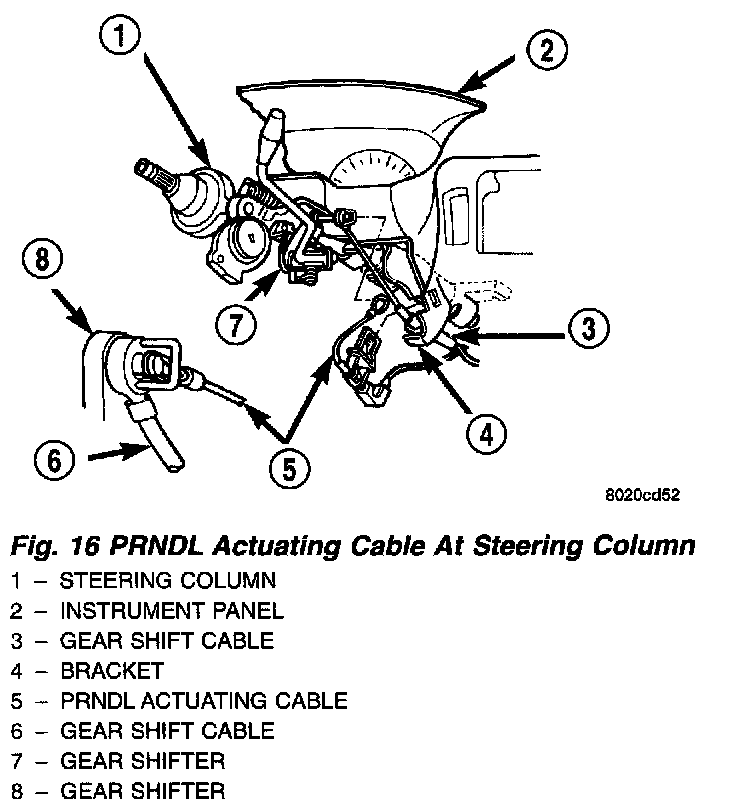 21. Remove the attaching clip for the PRNDL actuating cable from the steering column shift cable bracket.