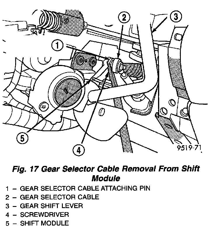 22. Remove the gear selector cable from the gear shifter the steering column. Gear selector cable is removed from pin on shift module by care fully prying it off with a screw driver.