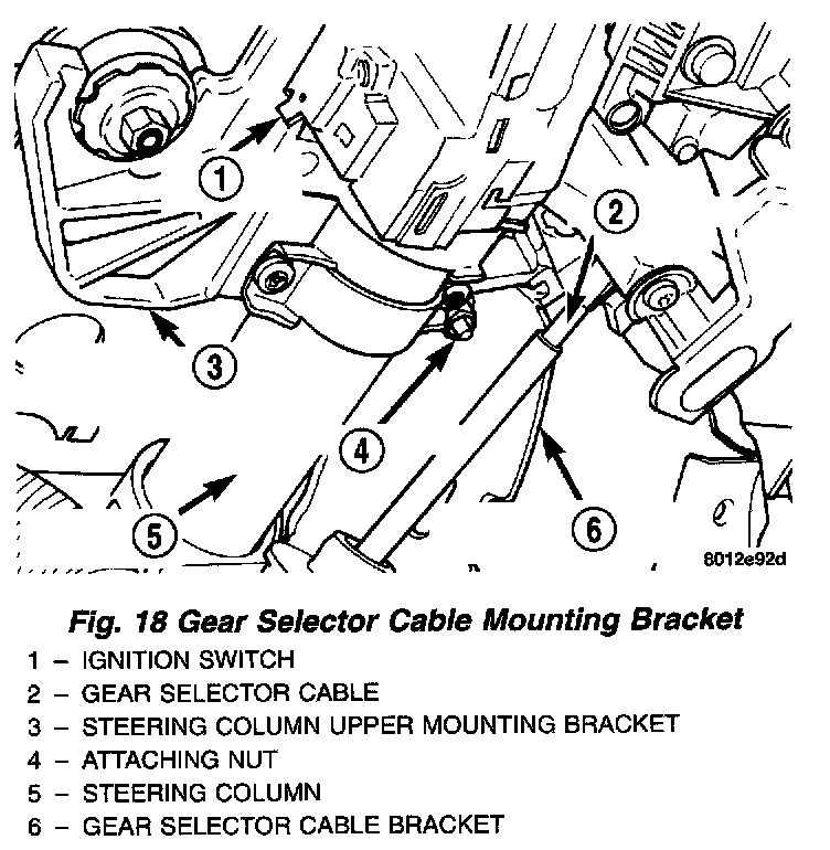23. Remove the gear selector cable and its mounting bracket as an assembly, from the upper mounting bracket for the steering column.