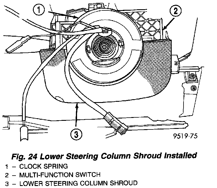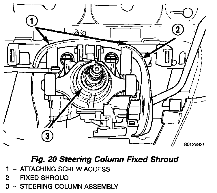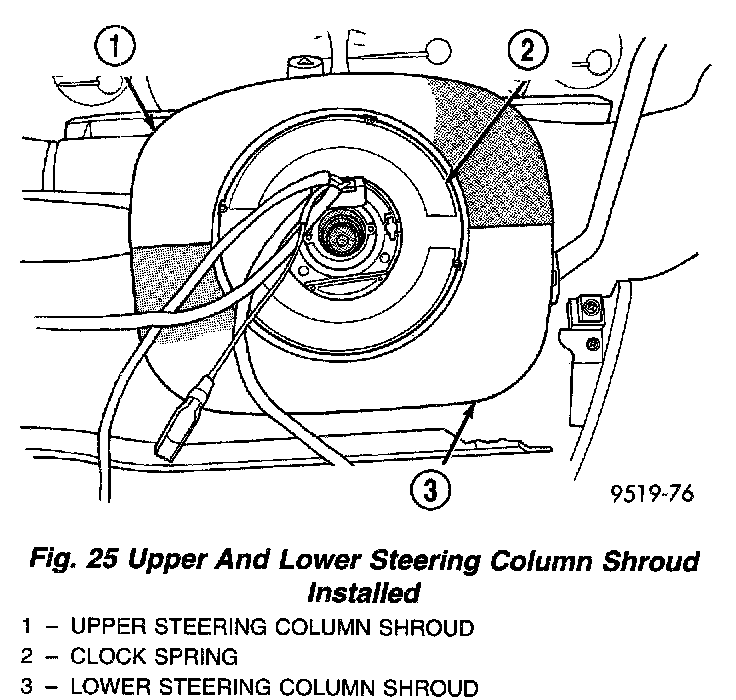 25. Remove the steering column fixed shroud from the steering column assembly. Shroud is mounted to steering column using 2 attaching screws accessed from top of fixed shroud.