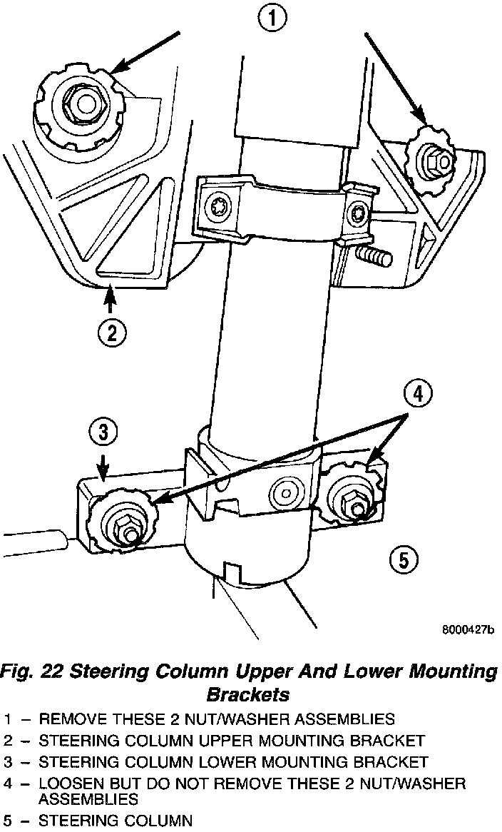 27. Loosen but do not fully remove the 2 nut/ washer assemblies attaching the steering column lower mounting bracket. Then remove the 2 nut/washer assemblies attaching the steering column .