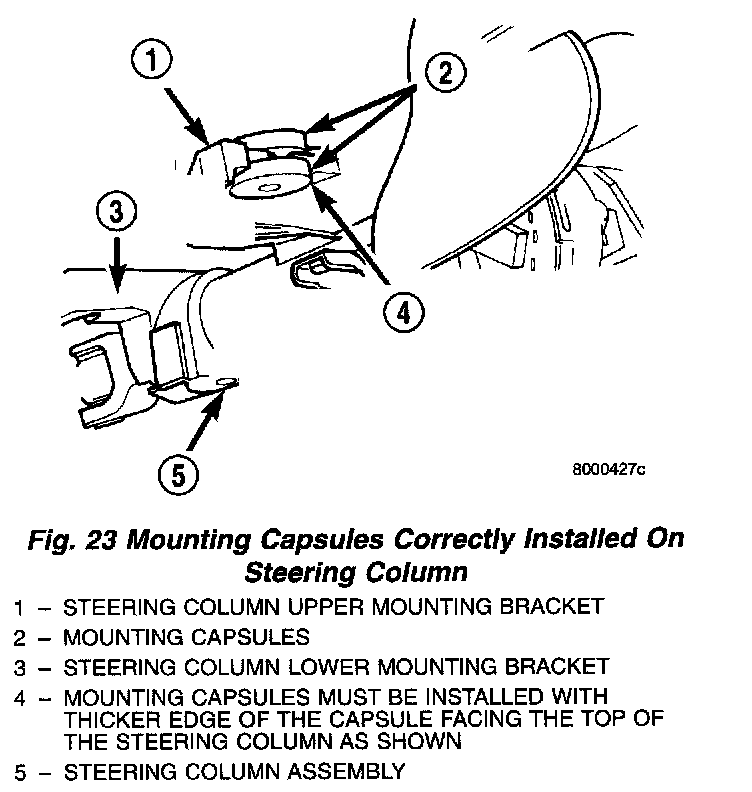 1. Ensure the plastic mounting capsules are installed in the upper mounting bracket of the steering column. Mounting capsules must be installed as shown in with the thicker edge of the capsule facing the top of the steering column.