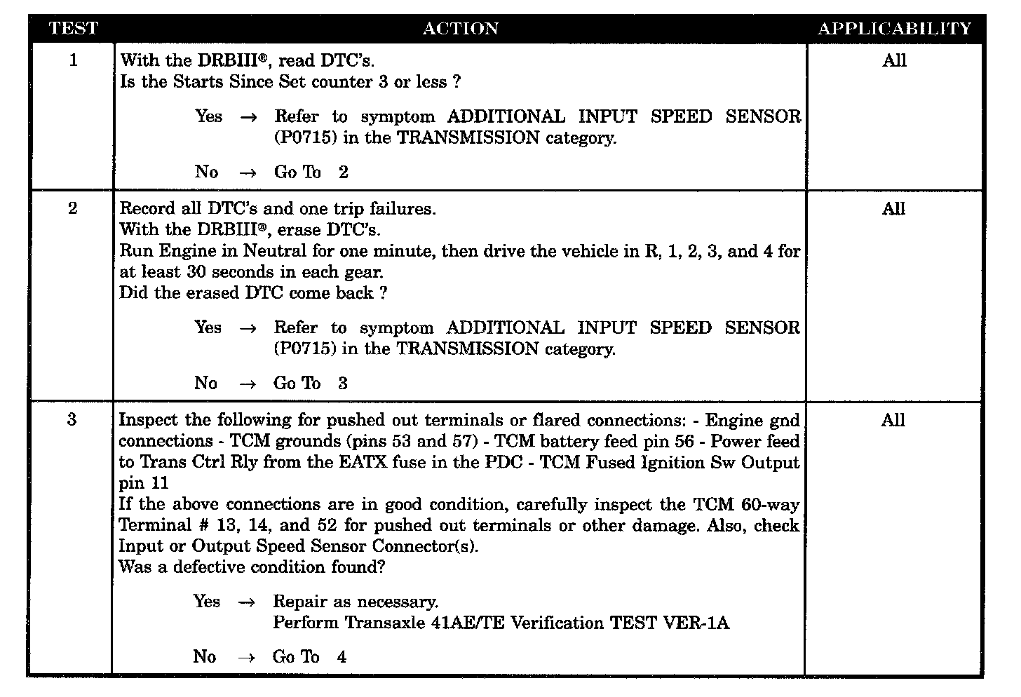 Set Condition: Upon detection of a speed sensor error the code sets as a one trip fault and will take 5 mins of substituted operation before the transmission is in LIMP-IN. The code sets if there is an extensive change in input rpm in any gear.