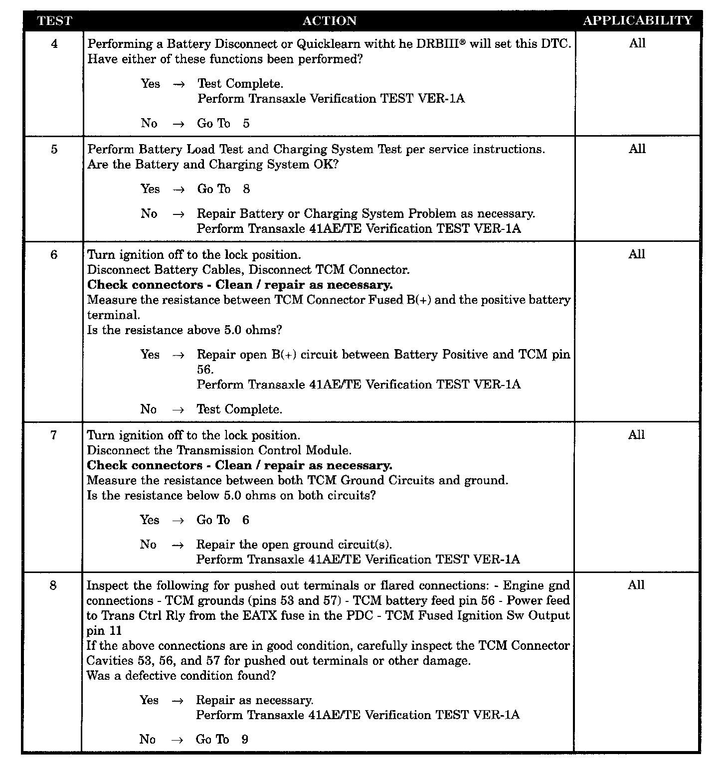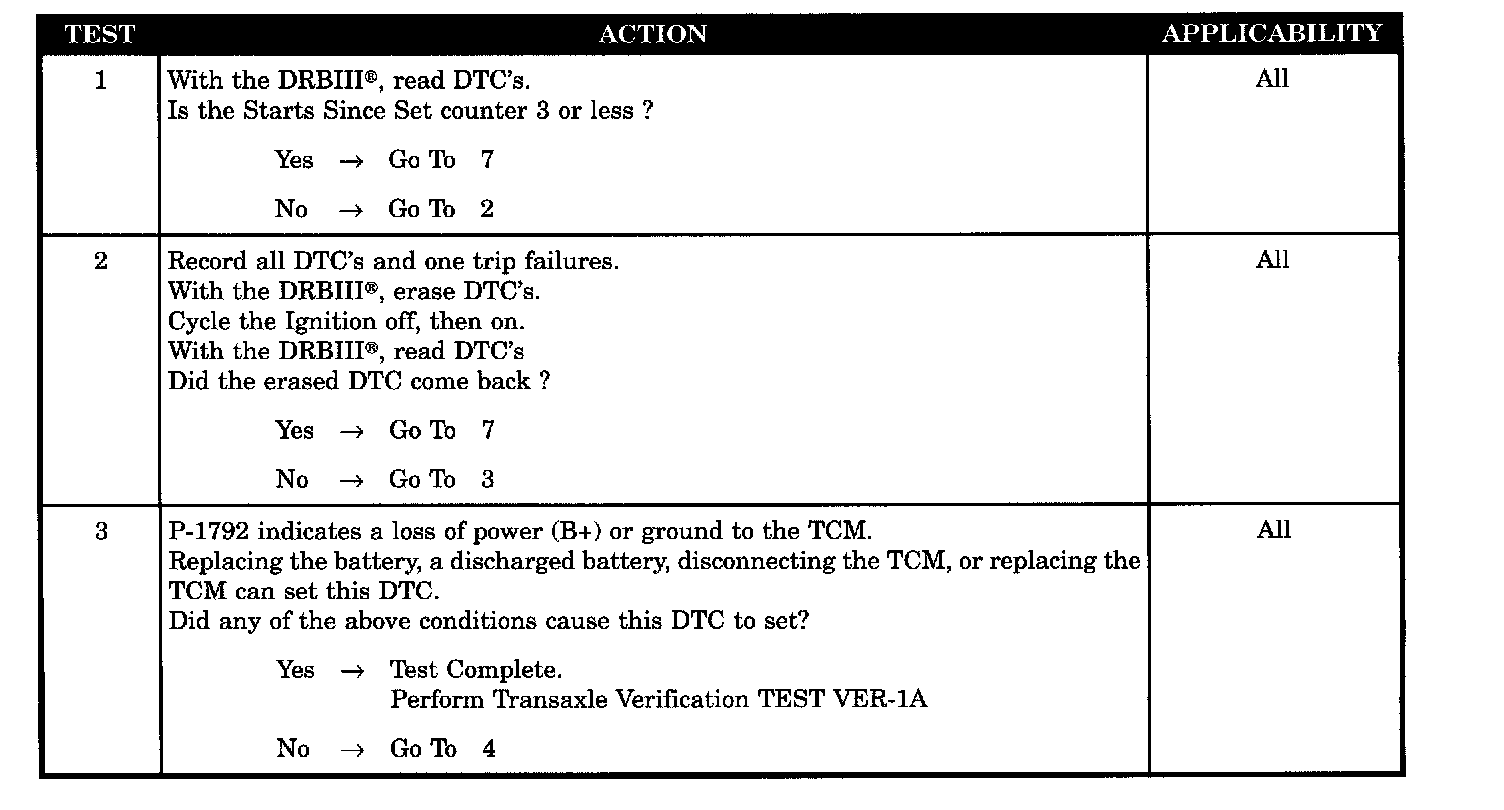 Set Condition: The code sets whenever the TCM is disconnected from B(+) or ground. It will also be set during the DRBIII "Quick Battery Disconnect" procedure.