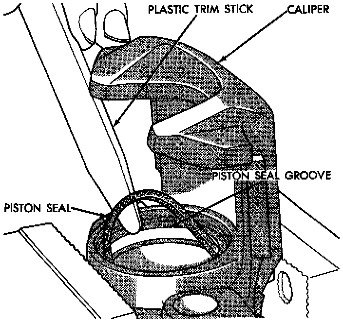 8. Using a soft tool, such as a plastic trim stick, work piston seal out of its groove in caliper piston bore. Discard old seal. Do not use a screw driver or other metal tool for this operation, because of the possibility of scratching piston bore or burring edges of seal groove.