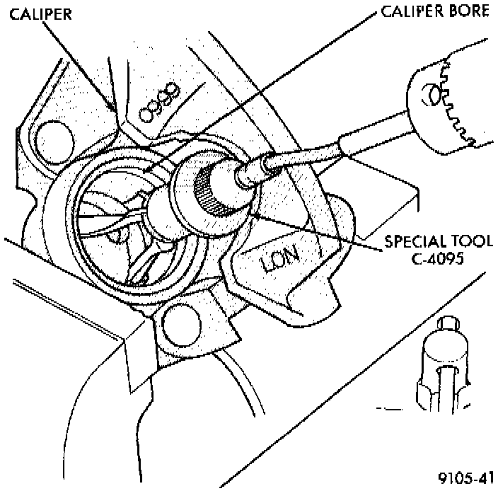 NOTE: When using Caliper Honing Tool, Special Tool C-4095, coat the stones and bore with brake fluid. After honing the bore, carefully clean the seal and boot grooves with a stiff non-metallic rotary brush.