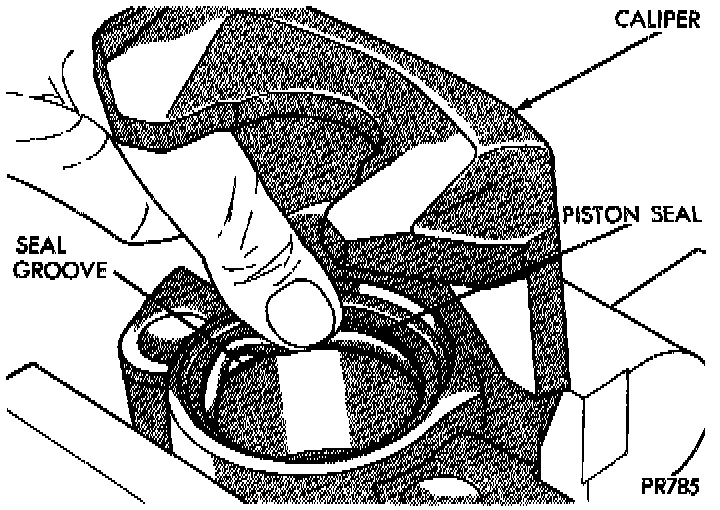 2. Dip new piston seal in clean brake fluid and install in the groove of the caliper bore. Seal should be positioned at one area in groove and gently worked around the groove , using only your fingers until properly seated. NEVER USE AN OLD PISTON SEAL. Be sure that fingers are clean and seal is not twisted or rolled.