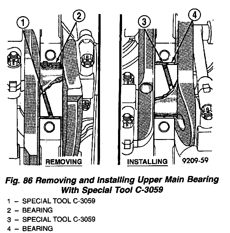 2. Remove bearing caps one at a time. Remove upper half of bearing by inserting Special Main Bearing Tool C-3059. (Fig. 86) into the oil hole of crankshaft.
