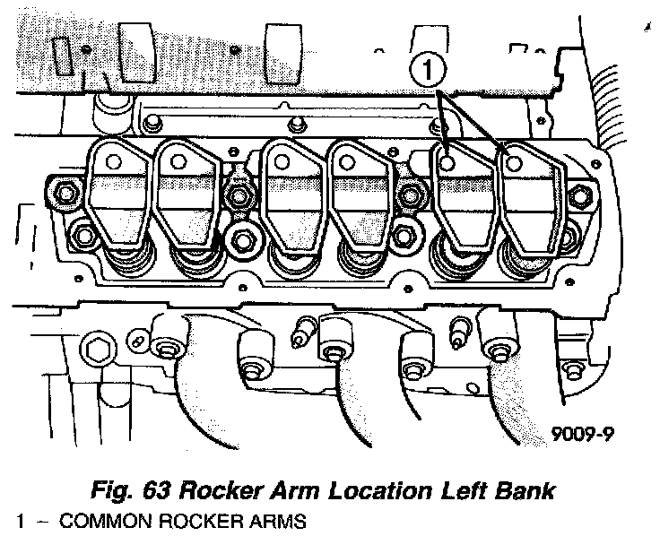 1. Install rocker arm and shaft assemblies with the stamped steel retainers in the four positions, tighten to 28 Nm (250 in. lbs.) (Fig. 63).