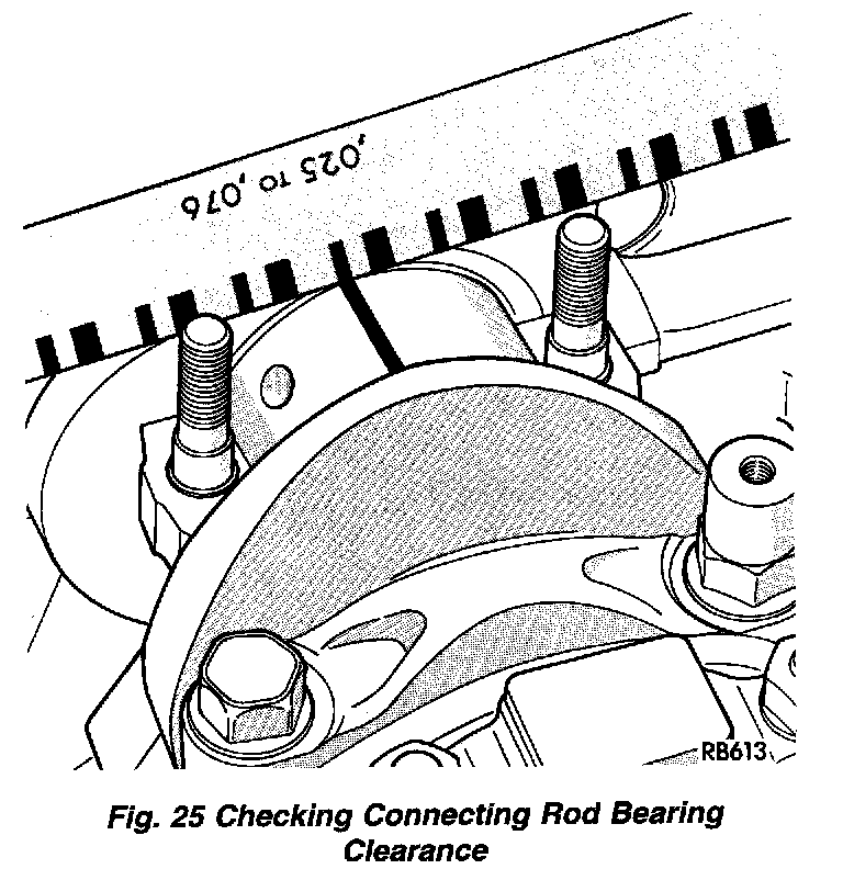 NOTE: The rod bearing bolts should be examined before reuse. If the threads are necked down, the bolts should be replaced. Necking can be checked by holding a scale or straight edge against the threads. If all the threads do not contact the scale the bolt should be replaced (Fig. 26).