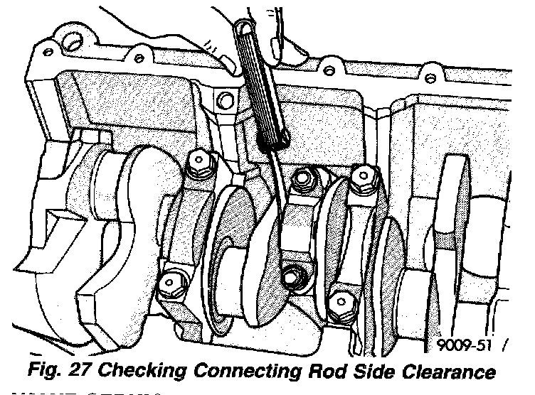 4. Using a feeler gauge, check connecting rod side clearance (Fig. 27). Refer to Engine; Specifications.