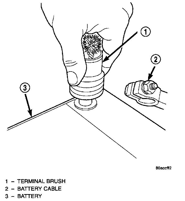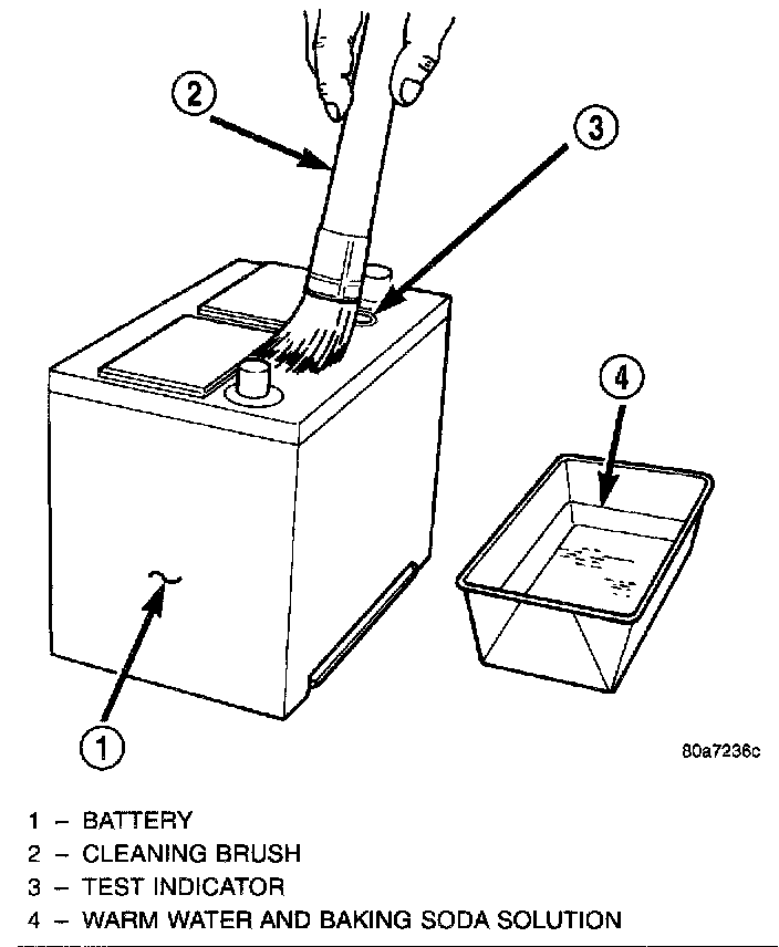CAUTION: Do not allow baking soda solution to enter vent holes, as damage to battery can result.1. Clean top of battery with a solution of warm water and baking soda.