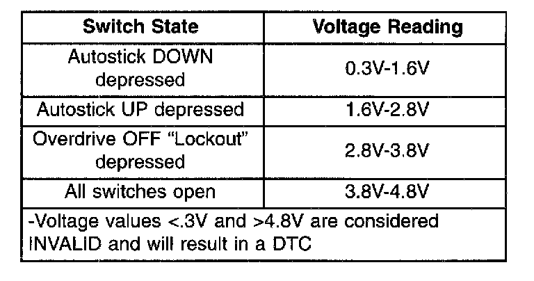 When the shift lever is moved into the Autostick position (as indicated by the Shift Lever Position Indicator in the cluster), the transaxle remains in whatever gear it was using before Autostick was activated. The TCM sends a 5 volt signal through the switch and then monitors the signal for voltage drop. Each switch state (driver command) results in a specific voltage reading sensed by the TCM. The TCM then determines transaxle operation (upshift/downshift/0D Lockout) based on their corresponding voltage.