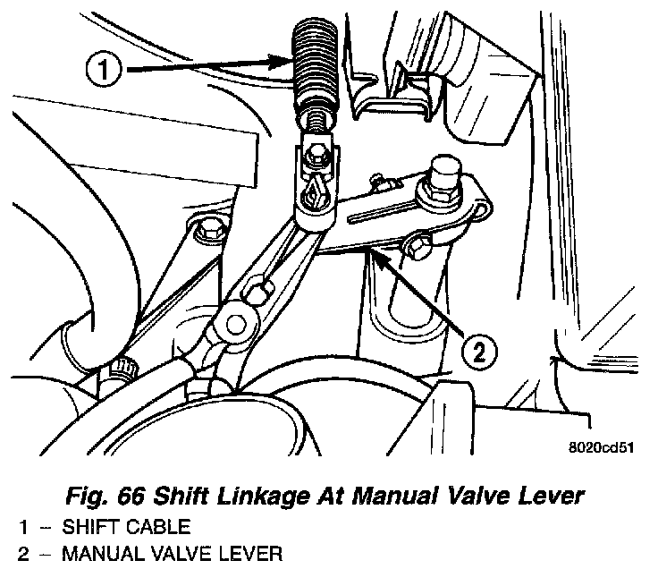 (2) Remove air cleaner duct. Disconnect transaxle shift linkage at manual valve lever (Fig. 66).