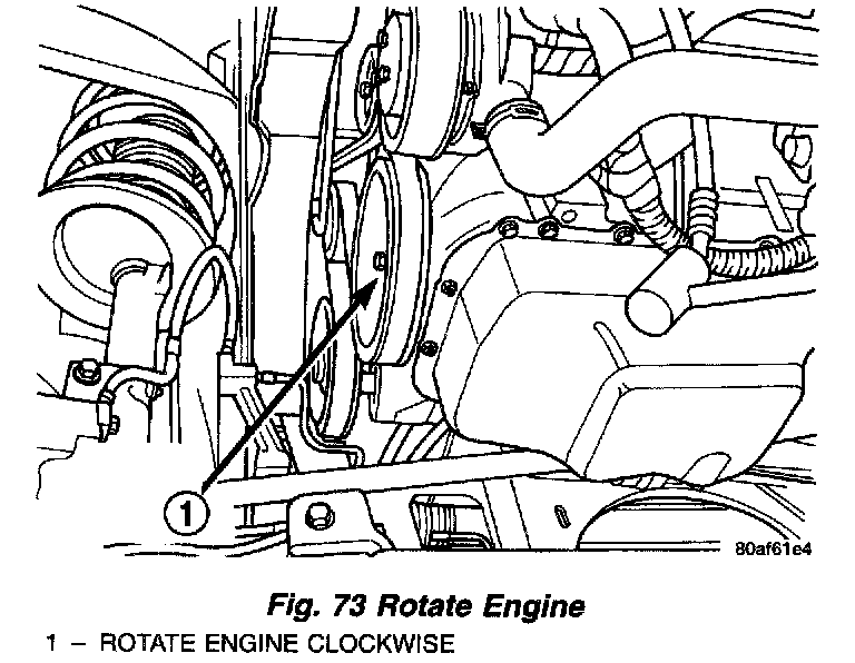 (18) Rotate engine clockwise to gain access to torque converter bolts (Fig. 73). Remove torque converter mounting bolts.