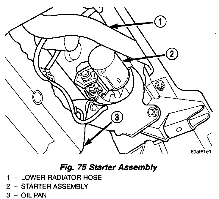 (22) Remove starter bolts and set starter aside. Do not allow the starter to hang from battery cable (Fig. 75).