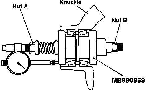 a. Position tool No. MB990959 and dial indicator to steering knuckle, then tighten tool nuts finger tight.