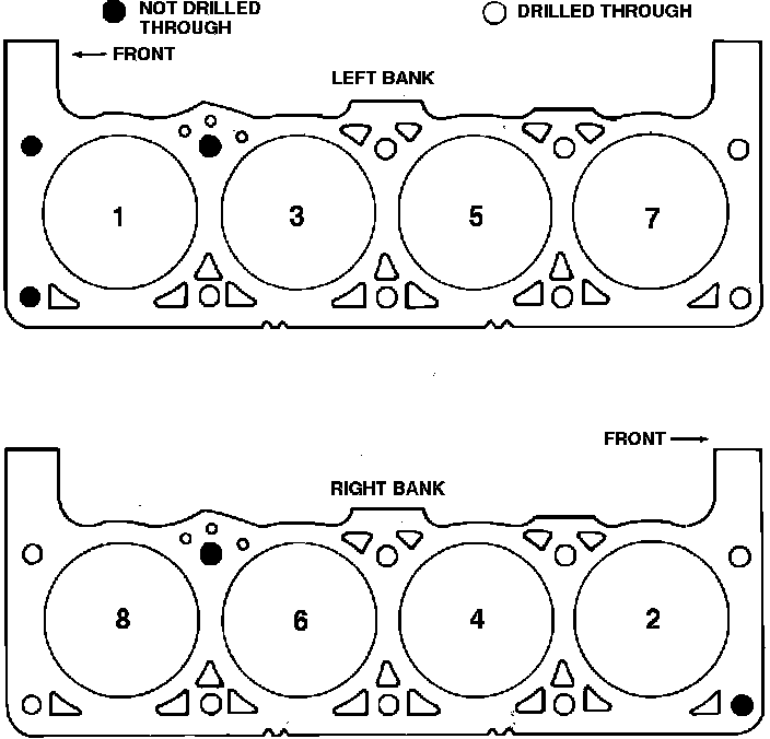 10. Reverse procedure to install heads and tighten bolts in sequence, Fig. 3. V8-318 engines have cylinder head bolt holes drilled through the block into the water jacket in certain locations, Fig. 4. Cylinder head bolts in these locations must have sealer 4057989 or equivalent applied to the threads to prevent engine coolant leakage. Ensure old sealer is cleaned from the threads before applying new sealer.