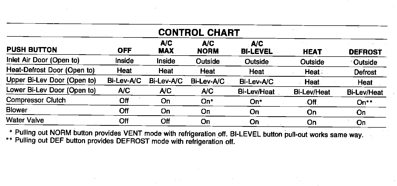 4. Refer to control chart, to check position of doors, operation of compressor clutch, blower motor, and water valve. Water valve is open when no vacuum is applied.