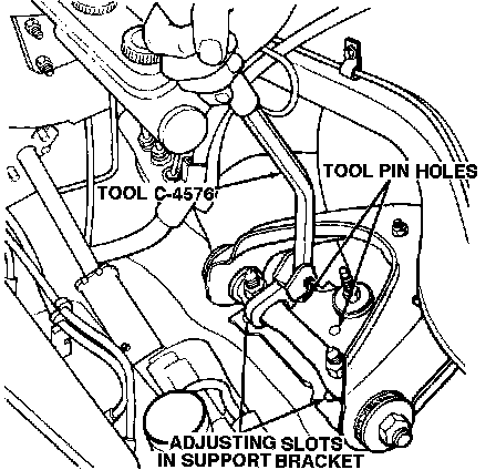3. On vehicles using cam bolts, the camber and caster is adjusted by loosening the cam bolt nuts and turning the cam bolts as necessary until the desired setting is obtained. On vehicles using pivot bars, tool C-4576 is required to adjust caster and camber. When performing adjustments, the camber settings should be held as close as possible to the "desired" setting, and the caster setting should be held as nearly equal as possible on both wheels.