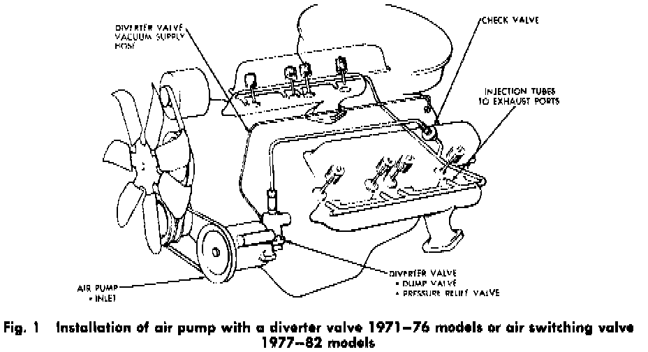 This system consists of an air pump,a diverter valve (1971-76), an air switching valve (1977-82), a check valve, an air manifold and the necessary tubes and hoses to connect the various components. Cylinder heads used on engines with this system have drilled passages to conduct the air to the exhaust ports.