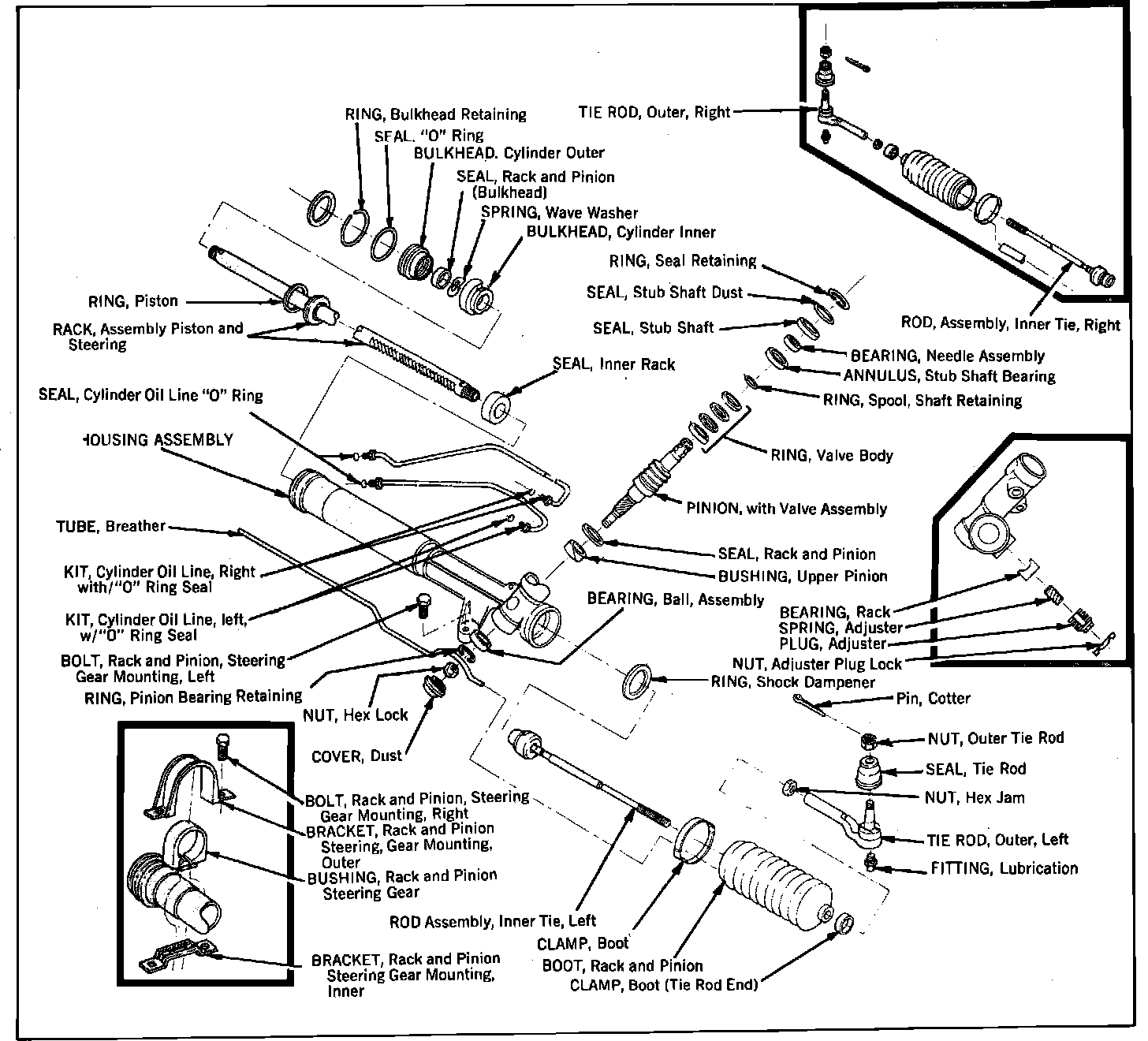 Fig. 1 Disassembled view of Saginaw rack & pinion steering gear. Dodge Omni & Plymouth Horizon & 1982---88 Charger & Turismo: