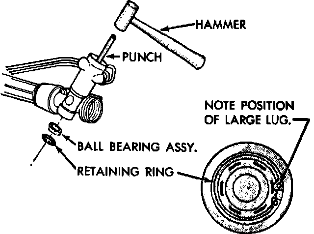 4. Install pinion shaft lower bearing into housing, using a suitable socket to press on bearing outer race. Use care to cock bearing in housing. Install retaining ring and position large lug of ring as shown.
